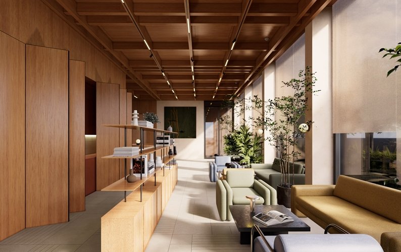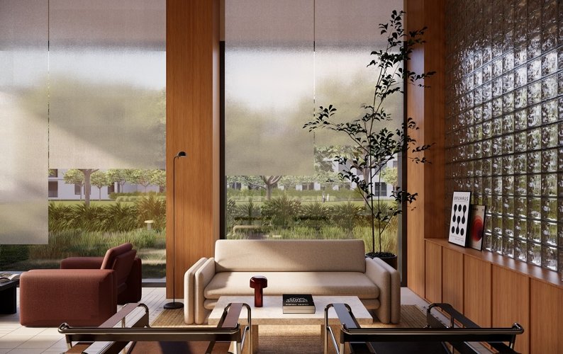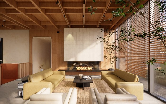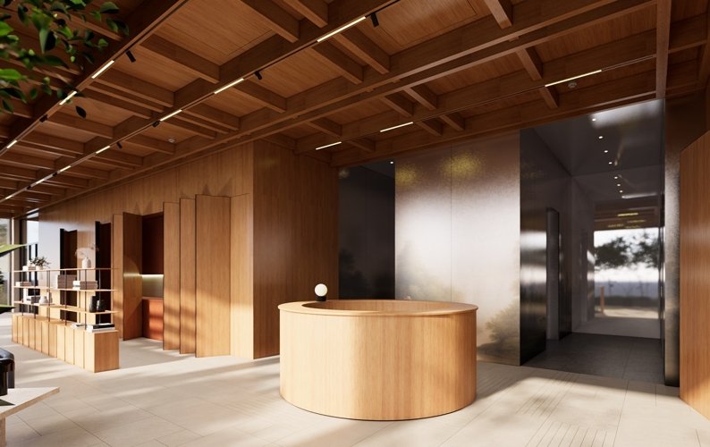 На первом этаже разместились гардеробная, кухня и закрытая зона переговорной, в которой можно организовать мероприятие, посмотреть кино или обсудить новый проект с партнерами по бизнесу, а поднявшись по лестнице на второй этаж, Вы окажетесь в камерной лаундж-зоне с библиотекой и камином.