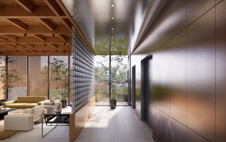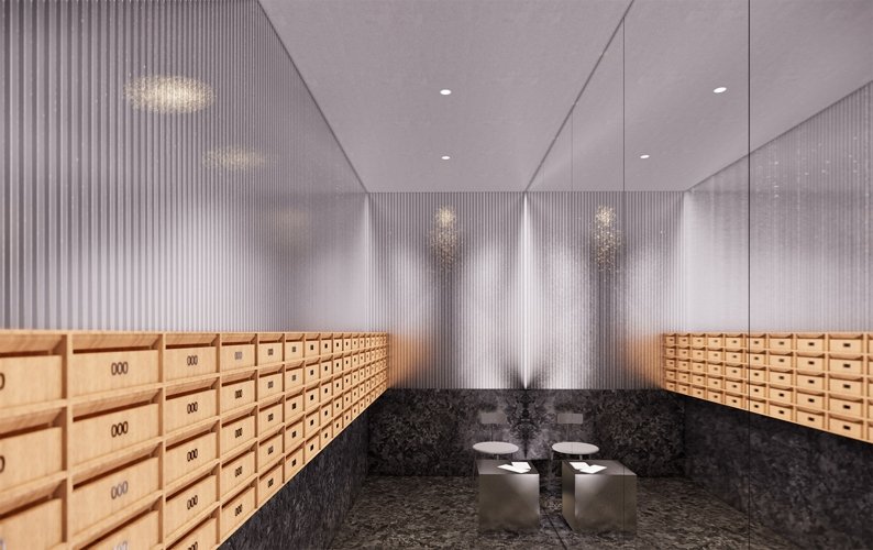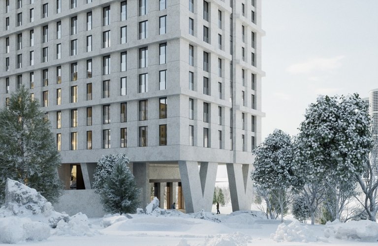 В глубине квартала расположен еще один корпус, отличающийся от других визуальной легкостью. Его динамичное остекление перекликается с фасадом и балконами соседнего советского «дома на ножках». Таким образом поддерживается архитектурное единство района.
