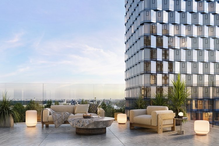 Доминантой MИRA стала изящная башня-маяк пепельно-розового цвета, в торце одного из корпусов. В ее верхней части находятся квартиры с угловым панорамным остеклением, что придает силуэту визуальную легкость. Башня соединятся с корпусом, обращенным в сторону набережной. В нем расположены остекленные террасы на верхних этажах, а панорамные окна обрамлены колоннами.