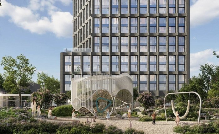 Детская и спортивная площадки, площадь с фонтаном, чайный домик, арт-объект, зоны работы и отдыха.